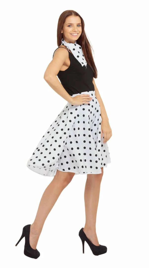 This long Ladies 1950’s Rock n Roll Skirt White and Black Polka Dot is great to get you into the rock and roll mood! Includes skirt and neck scarf.