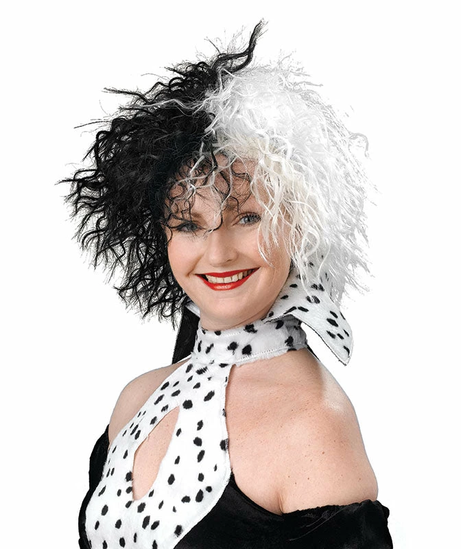 For the look of a famous movie character from the Disney film 101 Dalmations there is nothing better than this Cruella Deville style Dog Loving Diva wig a perfect item to be an evil madam for halloween Perfect accessory to go with our Cruella costumes and evil madame costumes