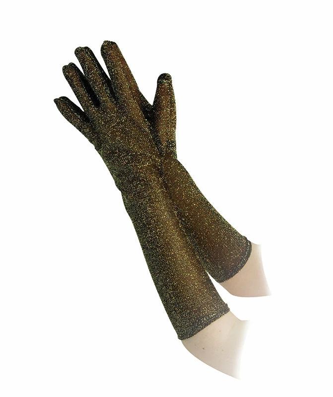 Long pair of Gold Glitter Gloves. Perfect for adding a touch of class to any fancy dress costume.