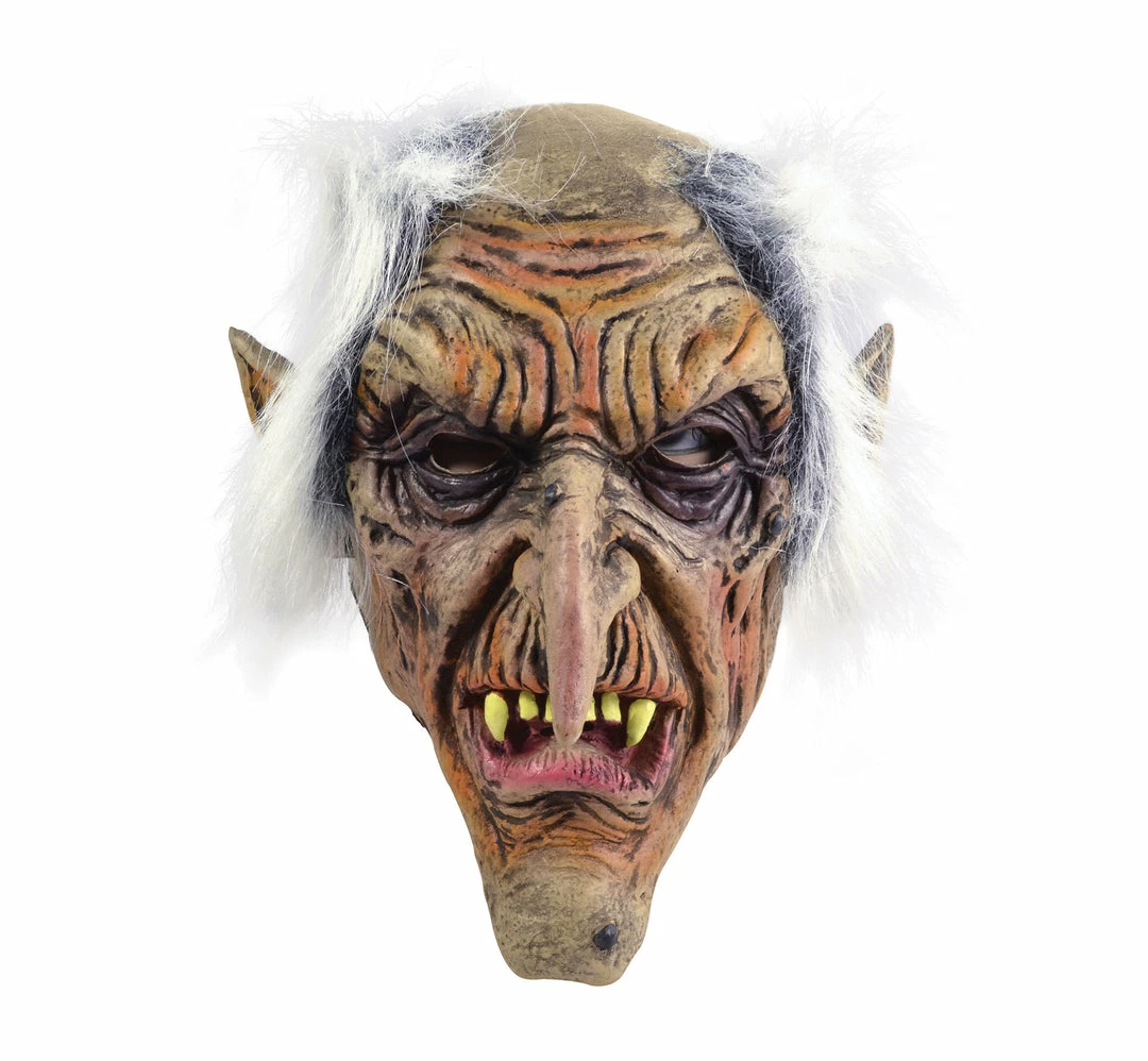 Adult sized over head rubber goblin fancy dress mask. Goblin Rubber Mask Size one size fits all Colour beige Rubber scary goblin mask Hooded style with white and grey hair at sides Perfect for dressing up