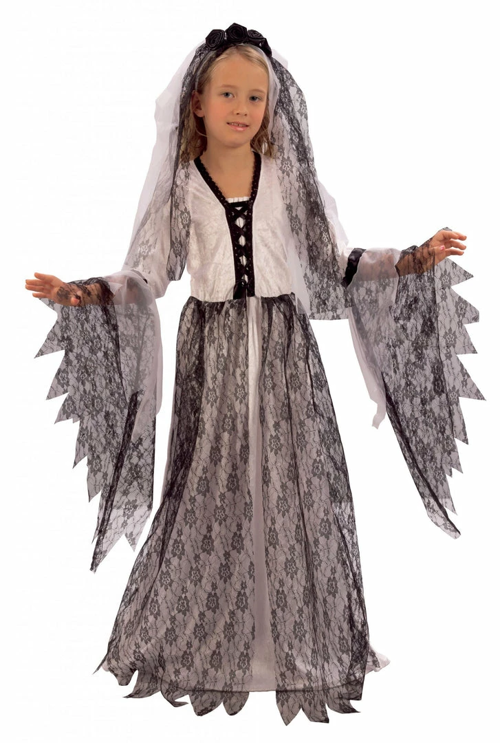 Corpse Bride costume includes long black and white designed wedding dress with wide sleeves and matching headpiece.