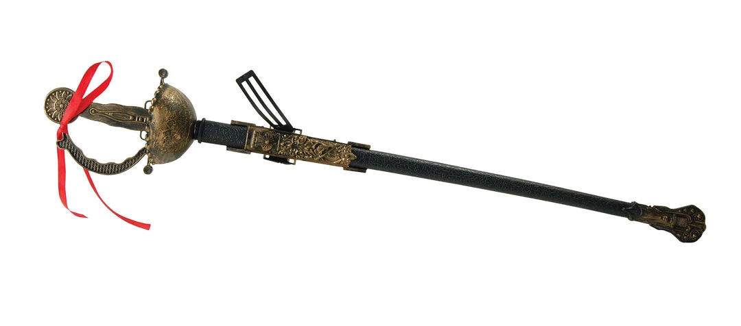 This toy sword is an ideal prop for School plays as well as being a great accessory for boys fancy dress. Plastic prop sword with bronze effect to handle and scabbard Scabbard (sheath) with belt loop Ribbon on handle Sword length 61cm (24 inch), with scabbard 27 inch Not suitable for under 5 Years