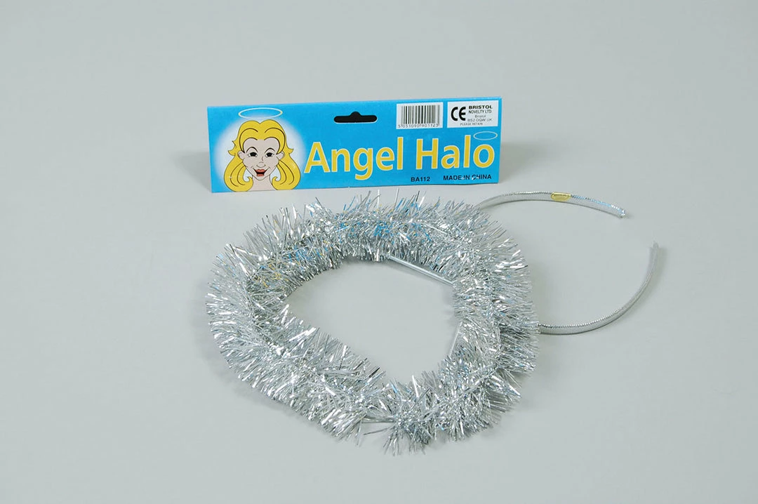 Silver Angel Halo Fancy Dress Accessory. Complete your Christmas Angel Fancy Dress Costume with this silver tinsel halo. Ideal for school nativity plays or just simply dressing up.