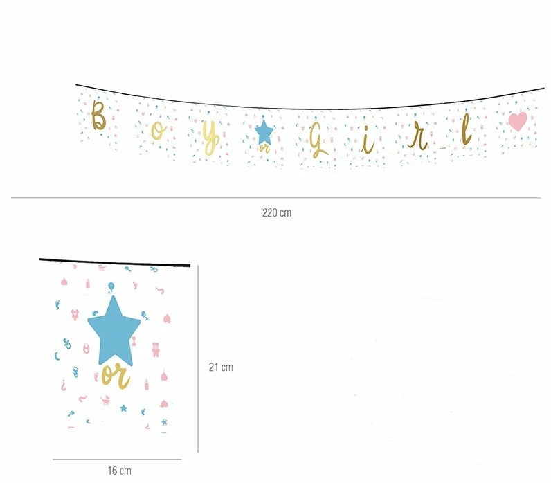 This Gender reveal bunting features gold inscription printed with the words ‘Girl or Boy’ to keep your guests guessing until it’s time for the big announcement. Perfect for gender reveal parties or baby showers.