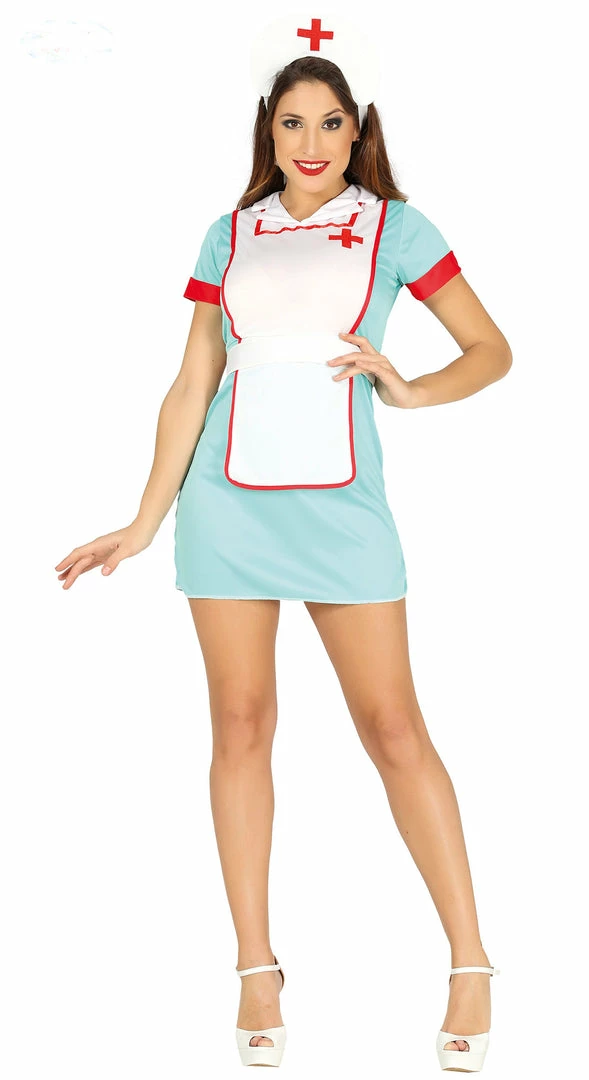 This nurse costume contains a blue red and white dress featuring, a red medical cross motif printed on the chest. Matching headpiece and belt.