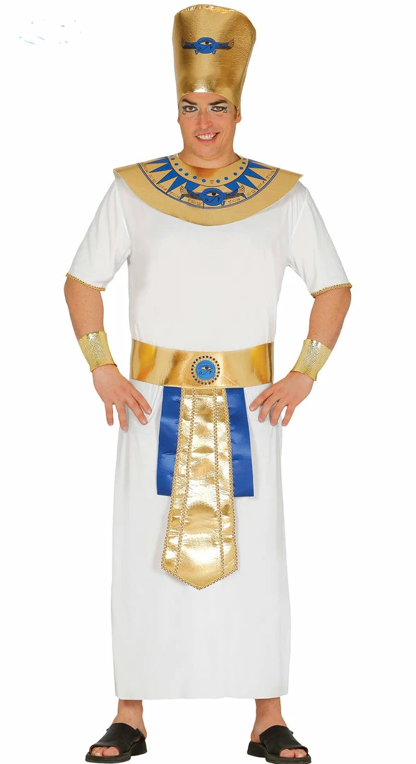 Create a lasting Empire and legacy in this Men’s Egyptian Pharaoh fancy dress costume. This regal costume comes with white ankle length Egyptian robe with a metallic gold belt with a blue trim. The costume also features a detachable gold collar and matching arm cuffs. Finishing it off is a tall matching hat.