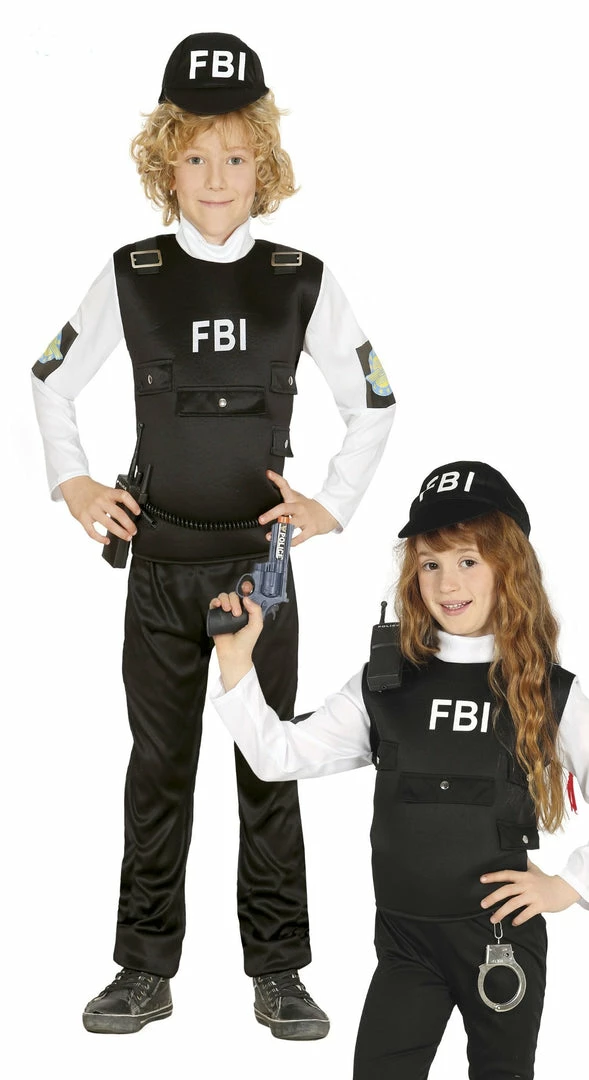 The children’s FBI outfit includes a long-sleeved shirt with a black vest in thin lined foam – pants – a cap adorned with a white FBI print.