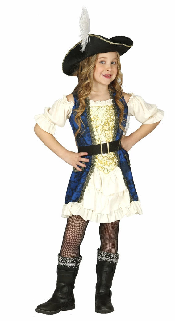Avast ye Landlubbers is what she’ll shout as a budding buccaneer in our Girls Luxury Pirate Costume. This beautiful costume includes cream dress with gold detailed front,blue velveteen effect waistcoat and black belt. Included hat finishes off the look finishes off the look. Excludes boots.