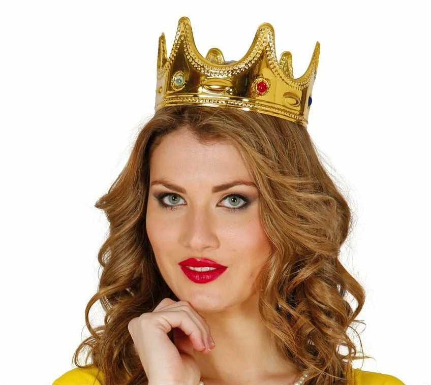 Attract your perfect prince when you add our gold Queen’s Royal Crown to your princess fancy dress costume. This gorgeous crown has an intricate pattern and is completed with faux jewels to give it the royal treatment. Perfect for both adults and older children.