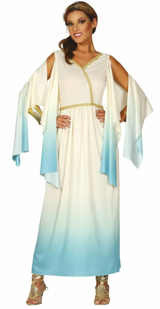 This ladies Greek Goddess outfit features an ankle length sleeveless dress and matching shoulder drapes fade from a cream color to turquoise, giving it an ethereal look. You’ll look like quite a goddess.