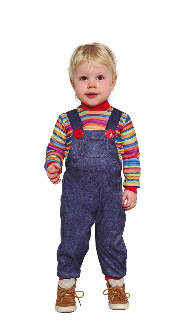 Styled after the movie Child’s Play this toddler Halloween outfit consists in blue dungarees with red buttons and stripy long sleeved shirt.