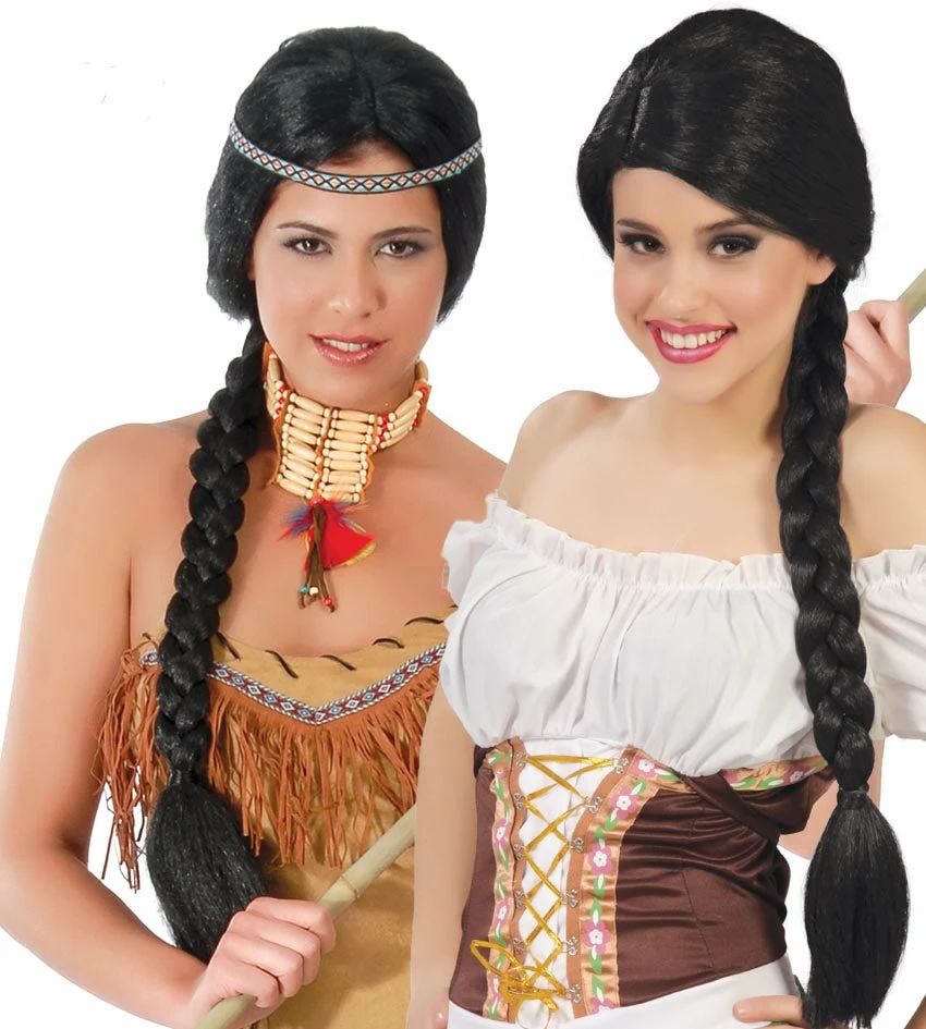 Ladies long black plaited Pocahontas Indian wig, can also be used as medieval maid wig.
