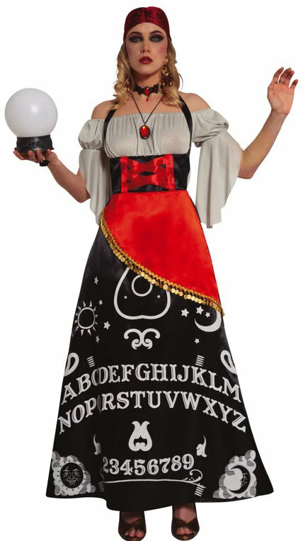Bring the power of the spirit board to bear when you wear this sinister Ouija Board Gypsy Fortune Teller fancy dress costume.