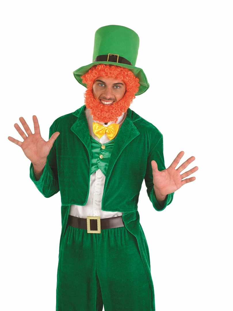 Leprechaun Costume comes complete with Green Trousers, Matching Jacket with attached White Shirt Insert, Belt with Buckle, Brown Shoe Covers, Top Hat with attached Ginger Hair and Beard.