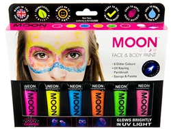 Our Moon Glow Glitter Gel UV Face Paint Boxset contains 6 Glitter Gel colours Pink, Yellow, Blue, Orange, Green and Purple UV Light Keyring Paintbrush Sponge and Palette