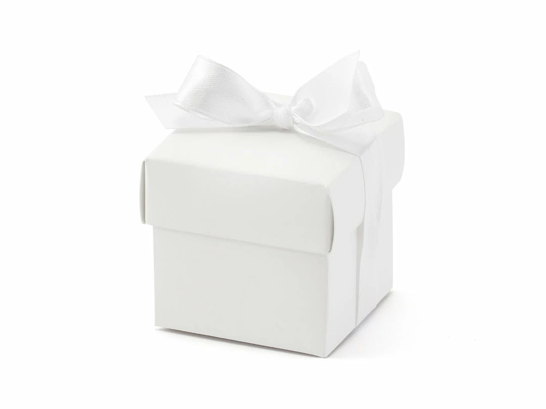 These fantastic cake Boxes made of white paper with a ribbon, ideal for guest gifts. Size after assembling 5.2×5.2×5.2 centimeters. Each pack contains 10 pieces.