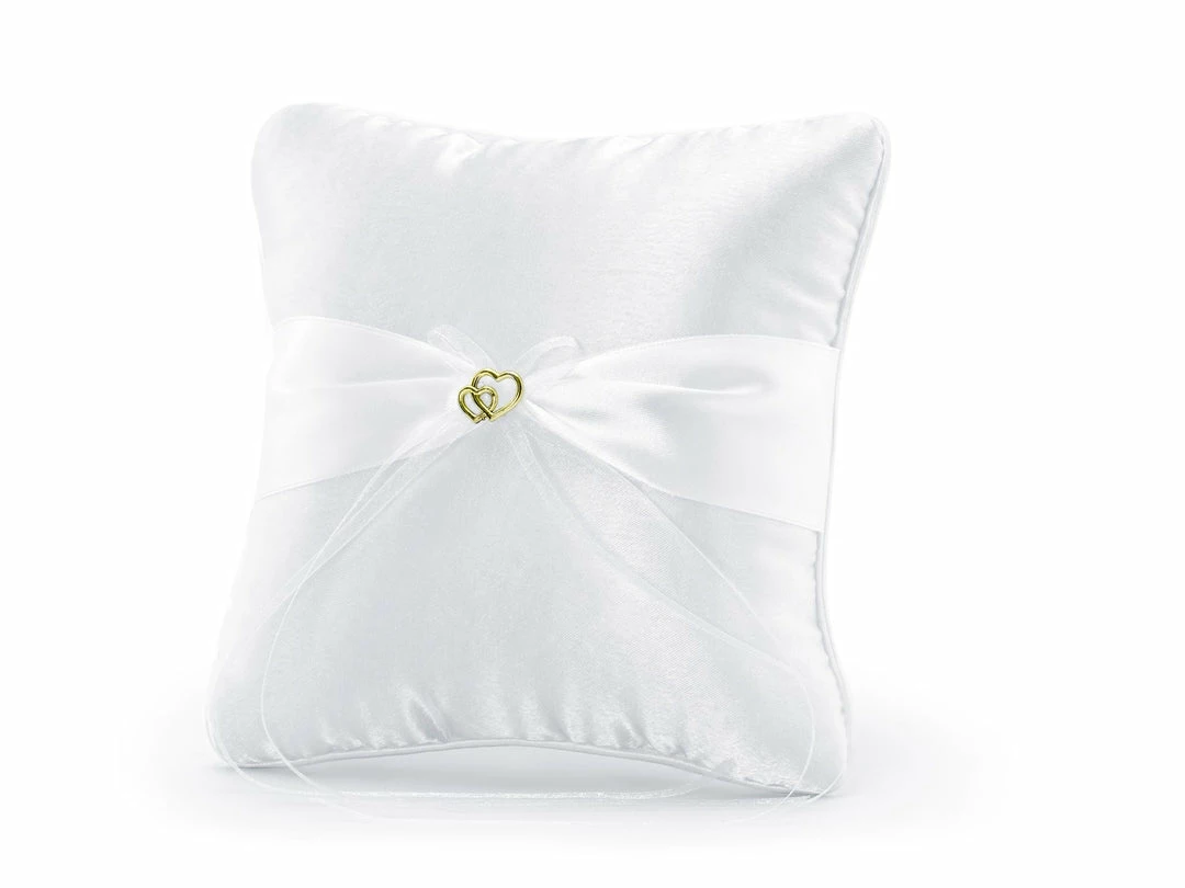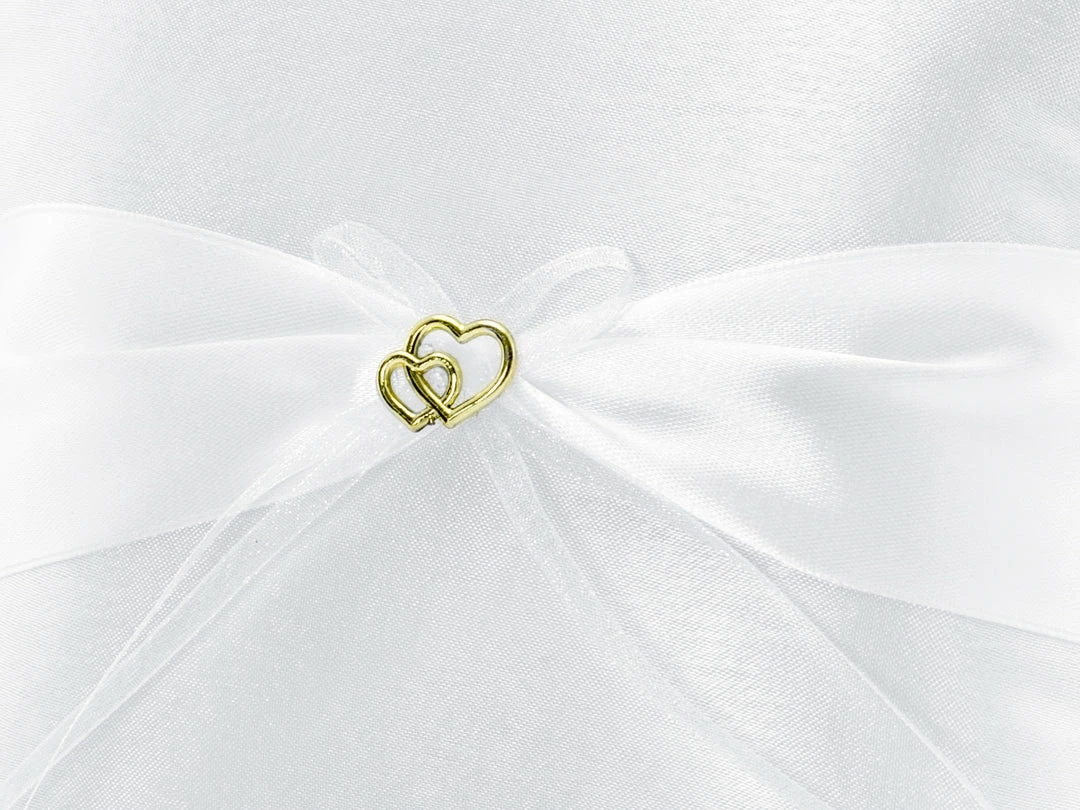 This romantic ring bearer pillow is made of white glossy satin with with white ribbon, chiffon ribbon and gold hearts for wedding rings.