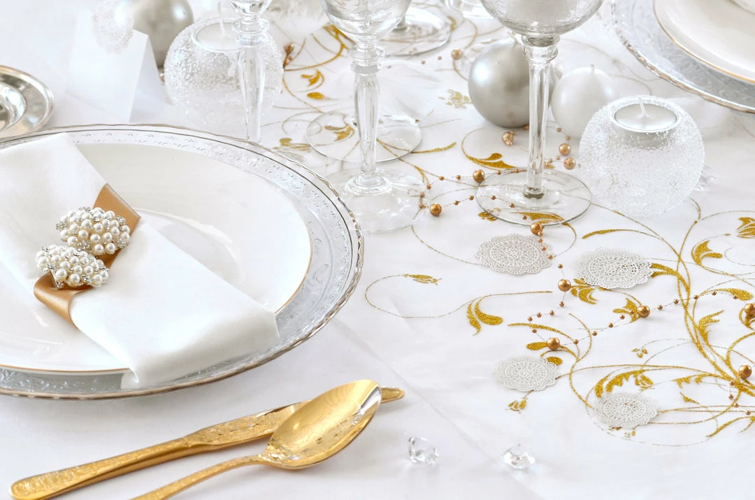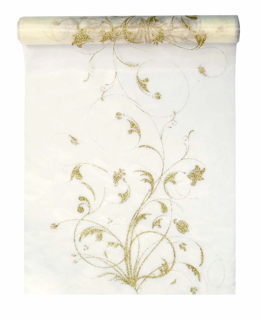 This beautiful cream table runner with one-sided gold brocade print will give your party a stunning look of elegance. It is made of Organza with delicate gold pattern printed on one side. The table runner is great for all kind of occasions like a wedding, birthday party, Christmas or a fabulous dinner with your friends.