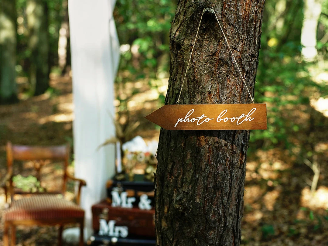 Perfect for weddings and other party events this double-sided signpost is made of wood with a white inscription “Photo booth”.