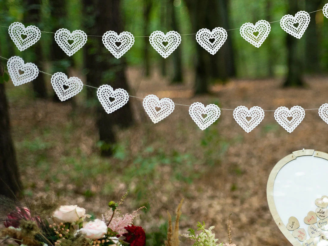 This gorgeous white Heart garland is the perfect decoration for your wedding day! It can be used at the wedding reception or even outdoor events.