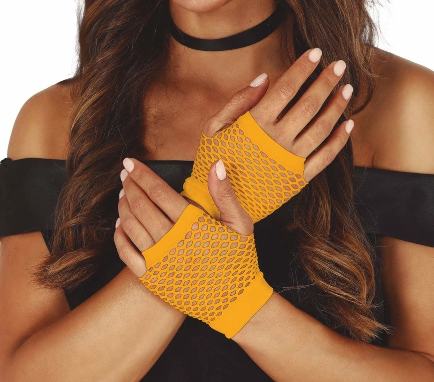 Stay funky fresh with our fingerless Neon orange mesh gloves. This retro yellow fishnet Glove features 80’s fingerless styling. Perfect for 1980’s themed events or parties.