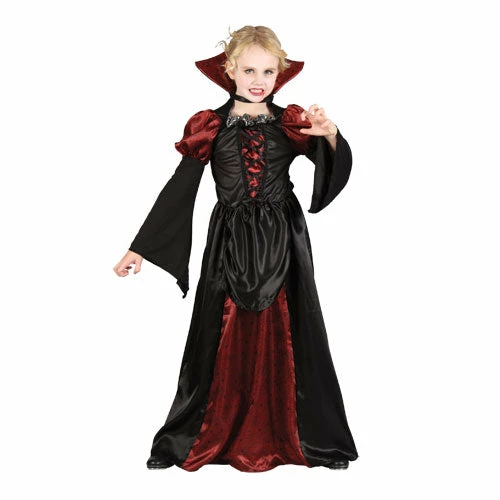 Scary Vampiress girls Halloween costume Corset style dress with flared sleeves Also includes separate vampire collar with attached choker ideal for any vampire or halloween themed party or childrens fancy dress Keep away from fire