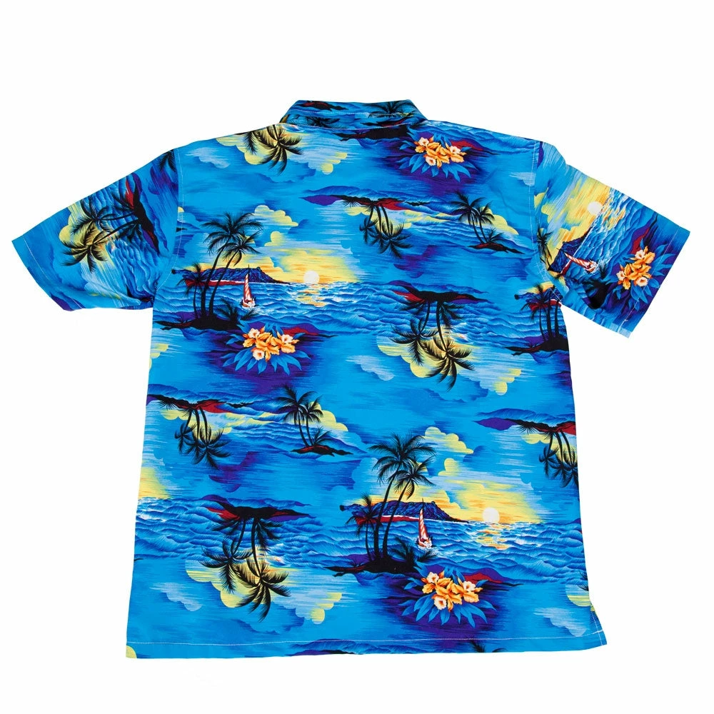 Hawaiian Shirt Blue Palm Trees Why not imagine you’re heading to tropical Hawaii at your next fancy costume party with this men’s Blue Palm Trees Hawaiian shirt.