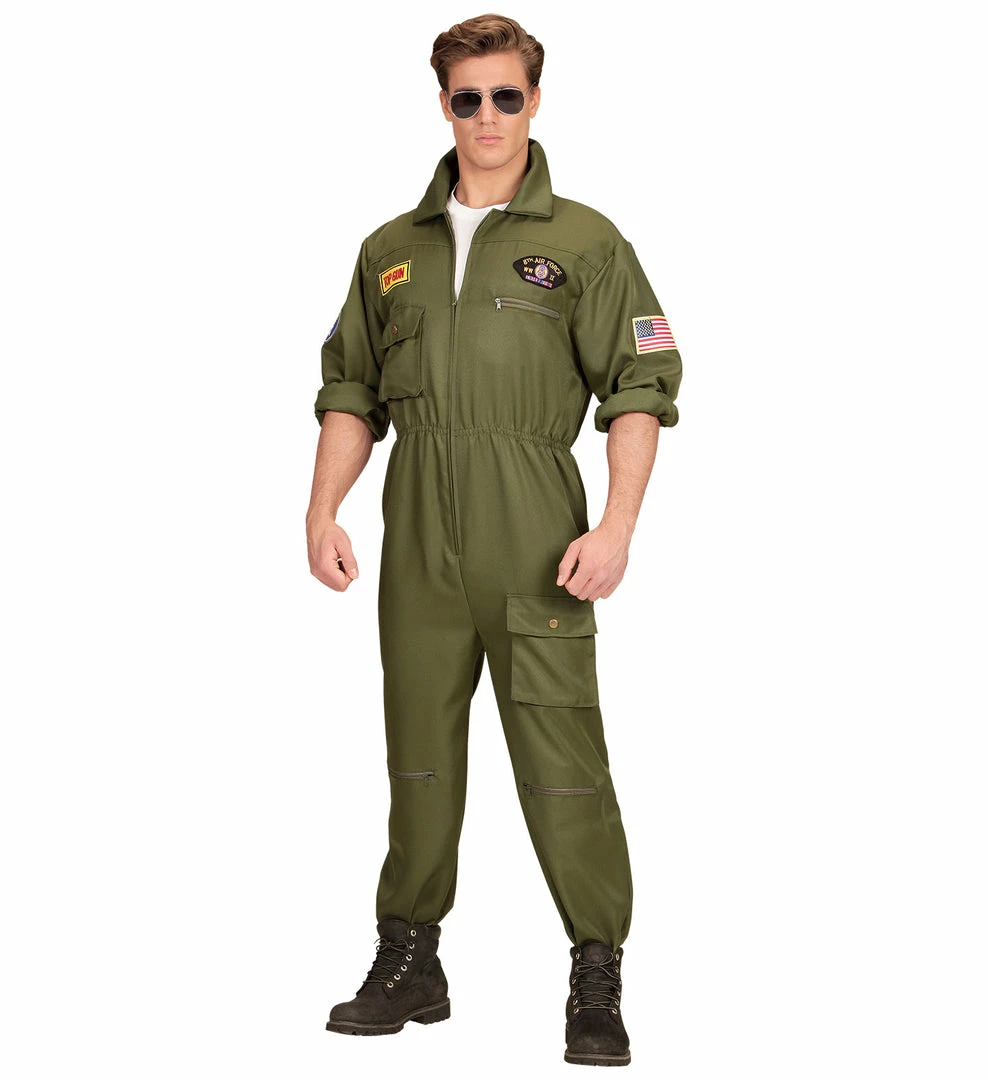 Take to the skies at any movie, Military or Uniform themed fancy dress party. Includes Green Jumpsuit with Badges. Just add some Biker or aviator glasses to complete the look.