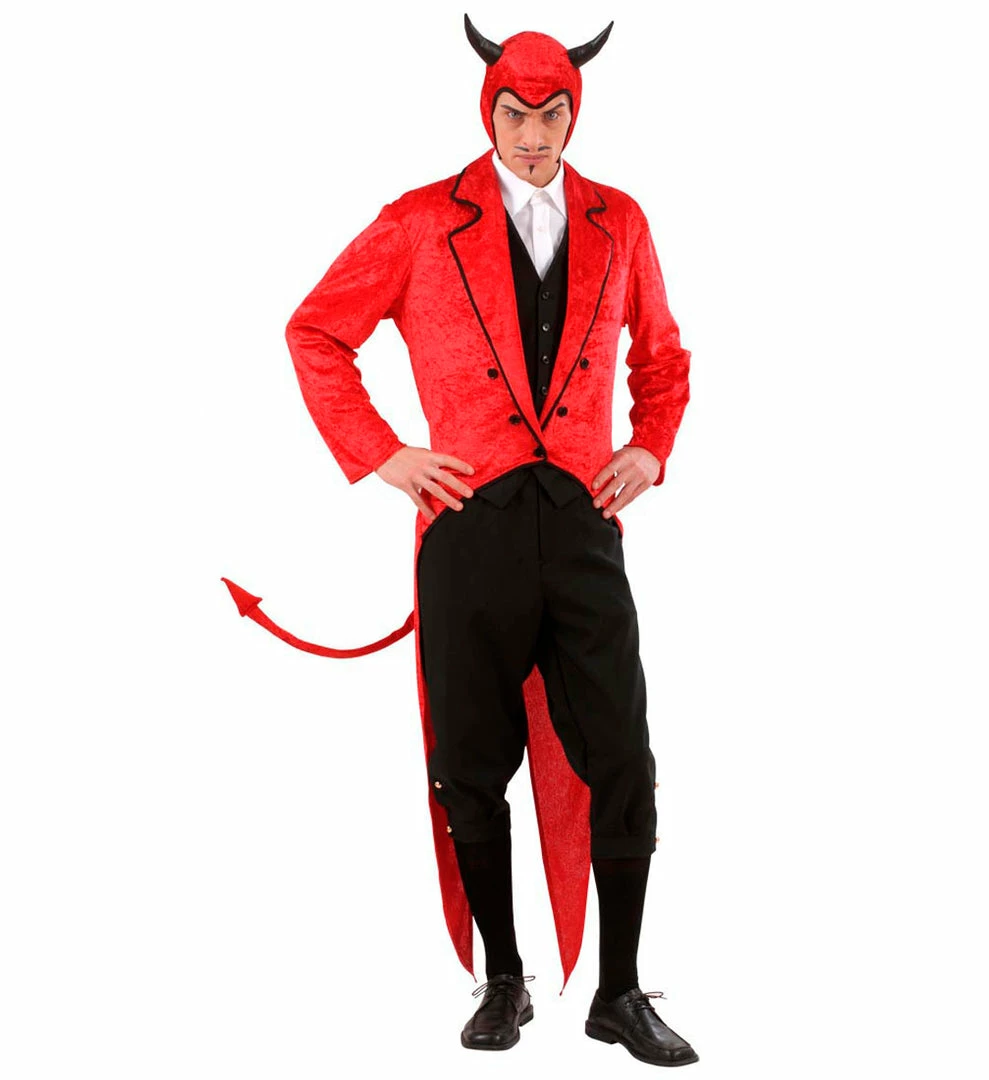 The devil outfit features a long sleeved red tailcoat featuring an attached long red tail and spike. This stunning tailcoat has wide lapels which are finished with contrasting black braid and the jacket is fastened with a single button but there is an extension to the button detailing either side. Completing the look is a matching Devil’s headpiece in red finished with a pair of Demon horns in black.