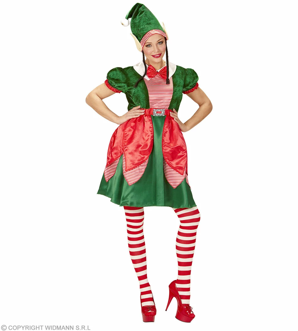 Great deluxe ladies Elf costume includes red and green dress with white collar and red bow at neckline. Also includes elf hat with attached plaits.