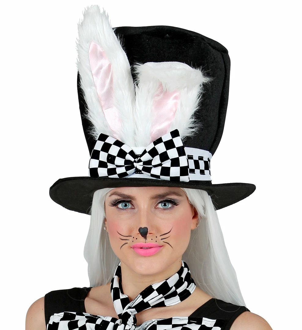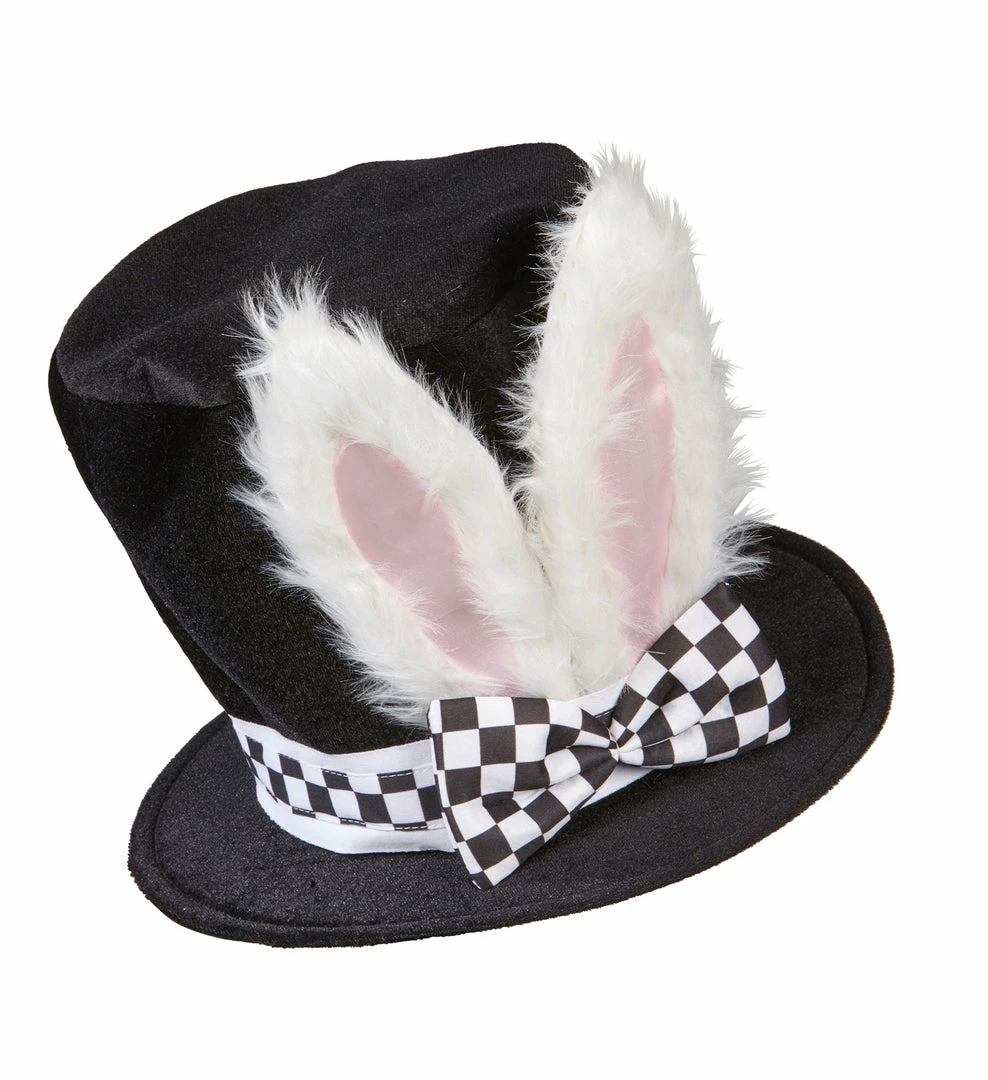 Perfect for any Alice in Wonderland party as the White Rabbit or even a hat party. This cute black top hat with bunny rabbit ears attached to a black and white checkered bow tie. Why not add a pocket watch and facepaints to complete look.