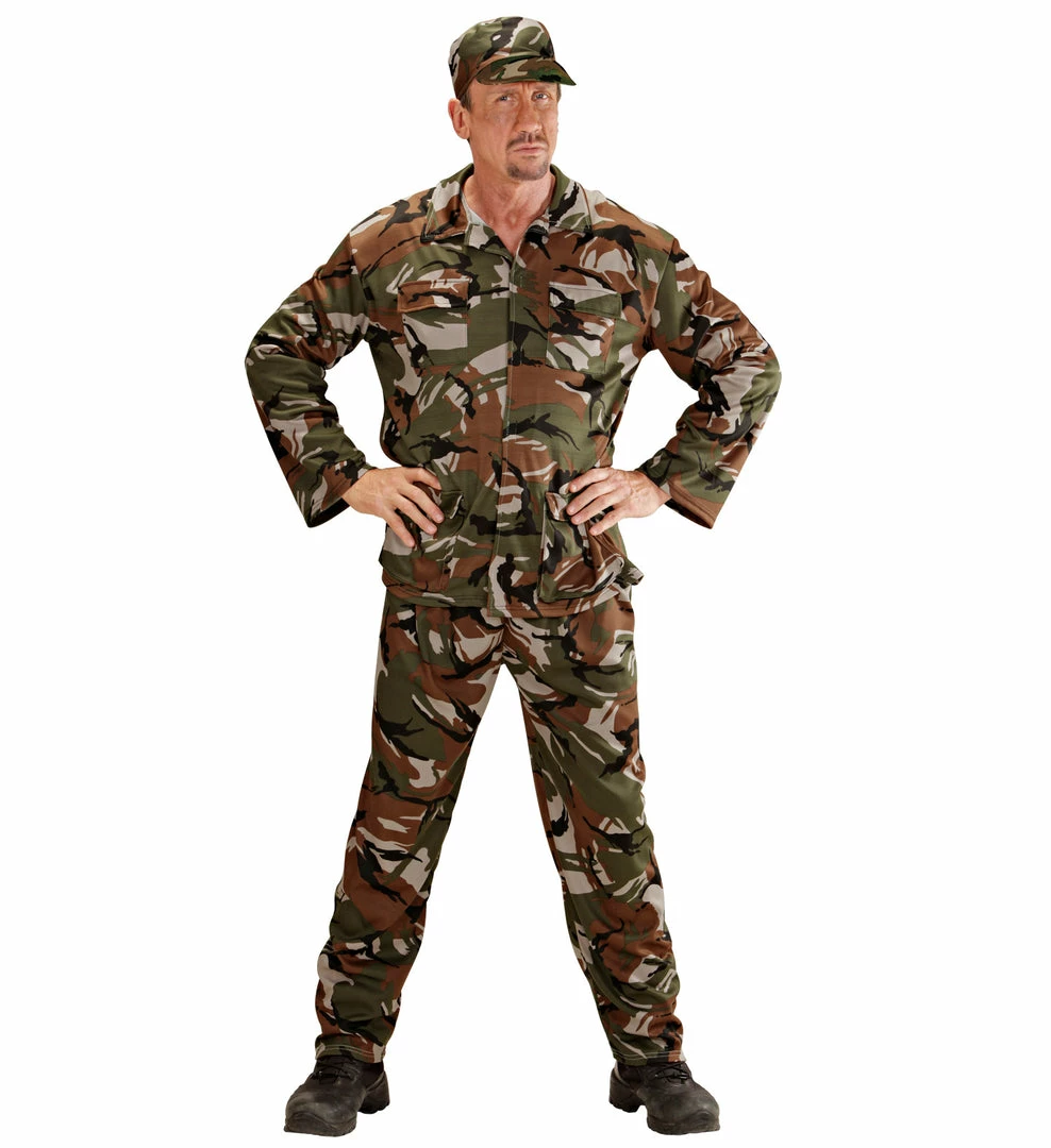 Included is a green and brown camouflage print jacket, a pair of matching trousers and completing the Soldier Fancy Dress Costume is a camouflage hat. A great costume, sure to have you standing out from the crowd at a military or uniform themed fancy dress party. Why not complete the look with a bullet belt and dog tags?