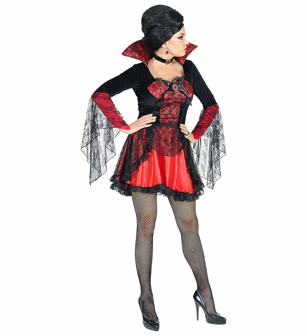 It comprises of a beautiful dress featuring a long sleeved blood red and black dress with long black lace at the arms and around skirt. This beautiful vampire dress also has a tall stand-up collar and is completed with a jet black choker to match gem on dress.
