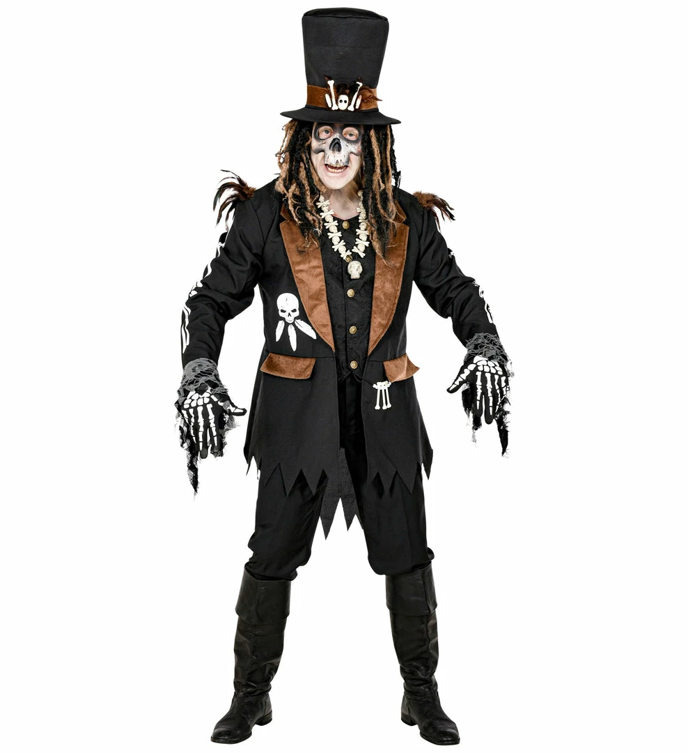 This adult voodoo costume features a black and brown jacket of a shamen and is decorated to display your true power as a witch doctor with the bones and skulls on it. The impressive hat will add the finishing touches to your Halloween costume.